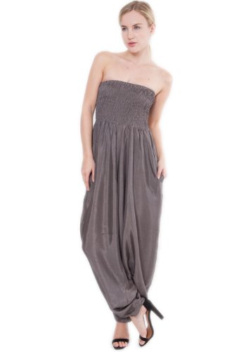 Notre pantalon-combinaison populaire et élégant vous offre un look et une sensation chic avec son tissu d'apparence soie. Une version large de notre pantalon / combinaison très versatile. Les poches aux côtés le rendent plus beau et flatteur. On peut la porter soit simplement comme un pantalon 'harem' ou comme une combinaison très confortable. C'est parfait pour le weekend et les jours de détente, et on peut facilement la transformer en tenue élégante avec les bons accessoires. C'est aussi génial pour la danse, le yoga, les festivals et le style 'casual chic'. La ceinture extensible s'adapte aux tailles 6-16. Pratique aussi pour la maternité.