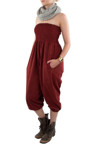On peut la porter soit simplement comme un pantalon 'harem' ou comme une combinaison très confortable. C'est parfait pour le weekend et les jours de détente, et on peut facilement la transformer en tenue élégante avec les bons accessoires. C'est aussi génial pour la danse, le yoga, les festivals et le style 'casual chic'. La ceinture extensible s'adapte aux tailles 6-16. Pratique aussi pour la maternité.