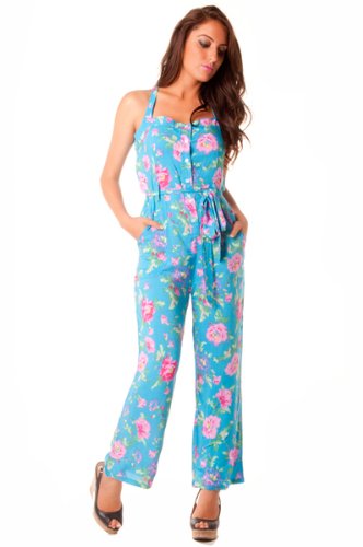 - Belle combinaison turquoise fleurie rose avec bretelle , bouton et ceinture parfaite pour l'été, taille S-M