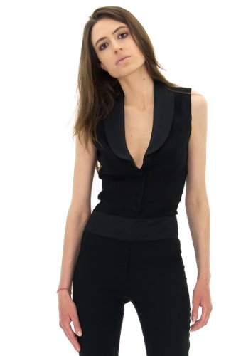 Voici une super combi-pantalon droit ceinturée à la taille , en crêpe envers satin noire sans manches pour un effet gilet avec un col smoking en satin ton sur ton , un vrai must pour celles d'entres vous qui souhaite troquer la robe longue contre un look très glamour masculin féminin très tendance cette saison ! A porter avec des escarpins très hauts pour encore plus d'effet ! A porter pour une soirée en parisienne chic ou vous ferez une entrée très remarquée ! Composition : 78% acetate, 21% viscose, 1% elasthanne Stefanie Renoma a imaginé pour vous une collection rare, entièrement réalisée à la main. Des créations structurées, chics et faciles à porter, composées de matières nobles et confortables empruntées au vestiaire masculin.