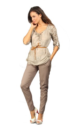 Tunique à manches longues retroussées, effet perforé. Col rond avec liens à nouer. Effet légèrement transparent. Les passants taille. Finitions revers. Longueur: 70 cm