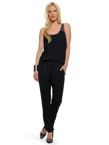 mbym Sisse Combinaison en noir, Coupe décontractée, Bretelles en tulle avec des pierres décoratives, Encolure arrondie, Cordon de serrage à la taille, Poches italiennes sur les côtés, Fermeture éclair à l'arrière, Longueur en taille S env. 160cm, Notre modèle porte la taille S pour une taille de 177cm
